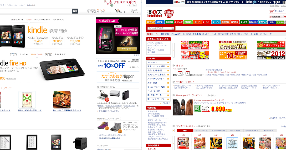 アマゾンvs楽天 「両雄」を徹底比較。ポイントが魅力の楽天。配送の早さはアマゾン。サービスの統一感ならアマゾン、多様性なら楽天。